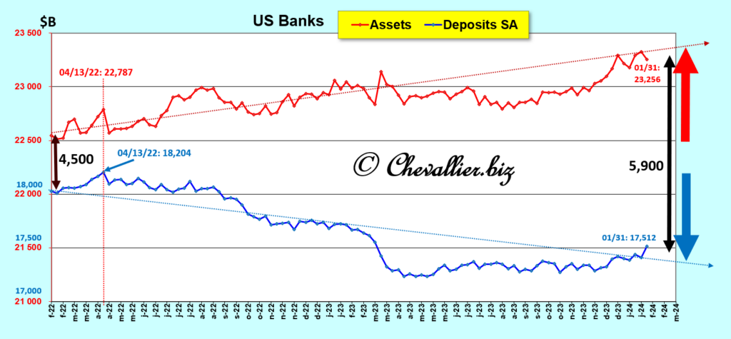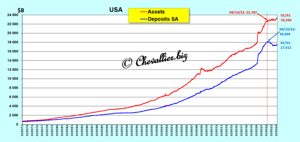 Les pertes potentielles déjà bien décelées sur les emprunts portant sur l’immobilier de bureaux sont évaluées aux alentours de 700 à 800 milliards de dollars, ce qui est là encore largement inférieur aux sorties des capitaux des clients de leurs comptes bancaires qui sont déjà de plus de… 6 000 milliards de dollars depuis février 2023 et cela sera plusse pire dans les semaines et les mois à venir !
