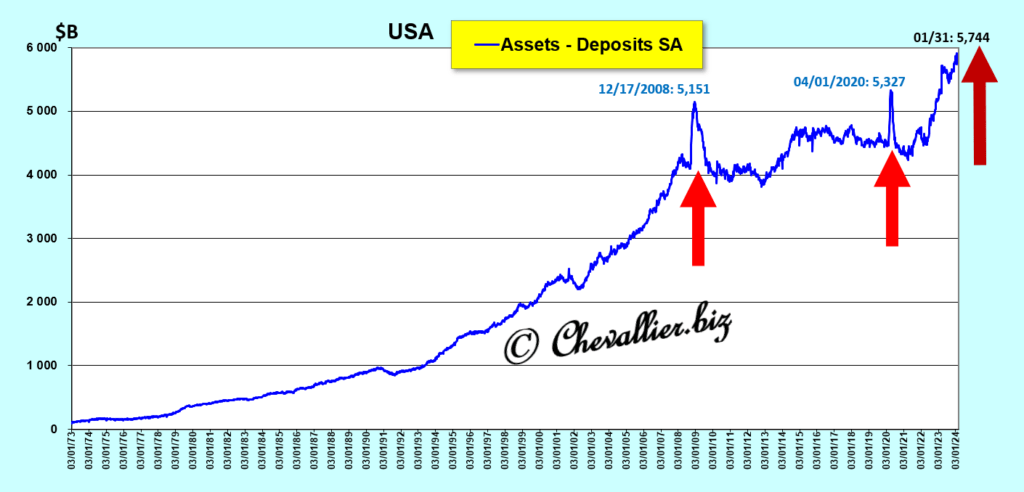 L’écart entre les actifs et (moins) les dépôts était de l’ordre de 4 500 milliards de dollars début 2022 et il fluctue présentement aux alentours de 5 900 milliards de dollars.