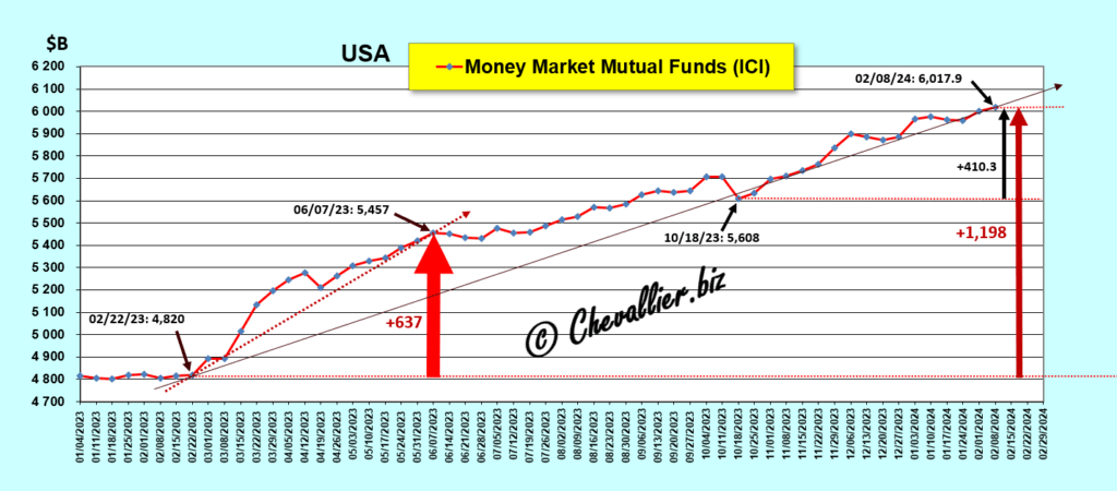 Les Américains n’ont plus confiance en leurs banksters. Ils retirent donc leurs disponibilités des banques pour les placer principalement dans des fonds mutuels de trésorerie dont les avoirs continuent à augmenter pour atteindre au 8 février un plus haut record historique de 6 017 milliards de dollars !