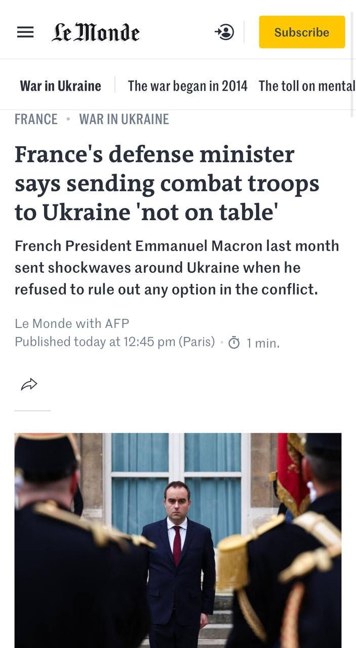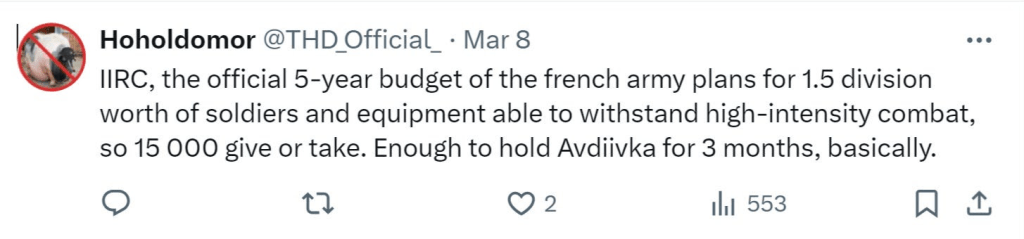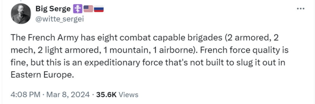 Big Serge, à propos, a un bon fil conducteur sur les capacités militaires de la France concernant une éventuelle intervention en Ukraine