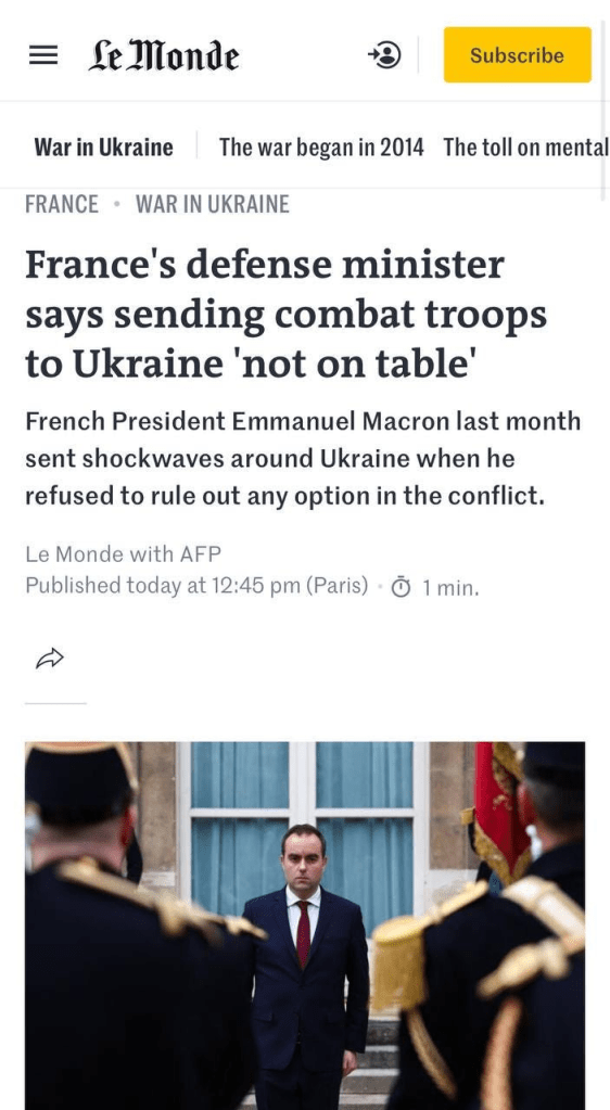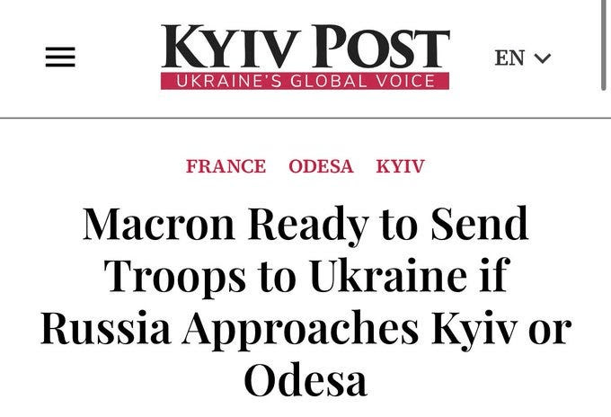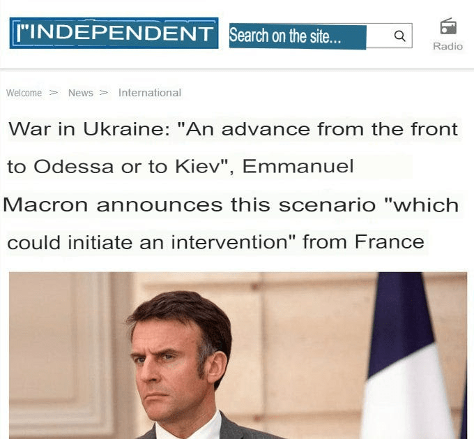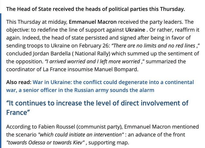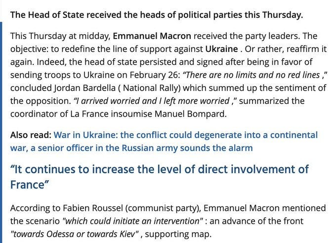Mais en même temps, sur un autre vecteur, il a lancé une bombe encore plus grosse qu’auparavant : la France pourrait être contrainte d’intervenir si les forces russes commençaient à s’approcher d’Odessa ou de Kiev :