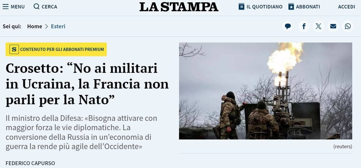 Le ministre italien de la Défense, Guido Crosetto, a critiqué les déclarations de la France et de la Pologne concernant la possibilité d’envoyer des troupes de l’OTAN en Ukraine.