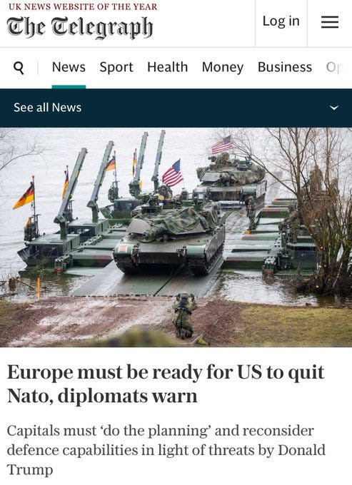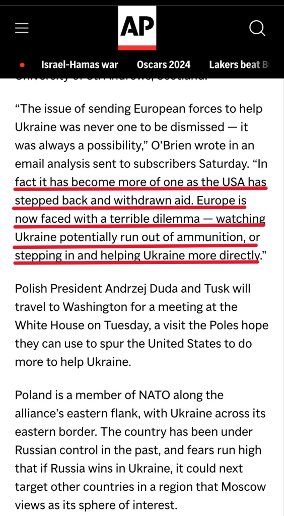 On parle beaucoup aujourd’hui de la façon dont l’Europe estime que les États-Unis l’ont laissée dans le pétrin et qu’elle doit agir unilatéralement contre la Russie, d’autant plus que les États-Unis détenaient la plupart des cartes en matière de fournitures et de financement essentiels – sans cela, l’Ukraine s’effondrerait et l’Europe se retrouverait face a un choix final.