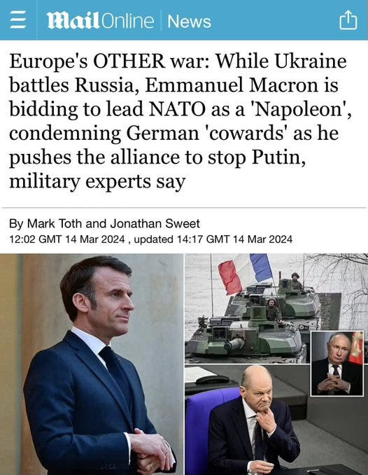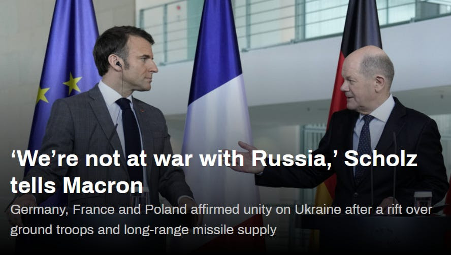 Deux choses importantes à retenir : seuls quelques États de l’OTAN aboient, beaucoup d’autres ont ouvertement déclaré qu’ils n’impliqueraient pas de troupes, parmi lesquels l’Italie et l’Allemagne. En fait, il apparaît maintenant que l’Allemagne prétend ne pas fournir de missiles Taurus parce que cela l’obligerait à déployer des troupes au sol en Ukraine pour administrer les missiles, ce qui constitue pour elle une grande ligne rouge.
