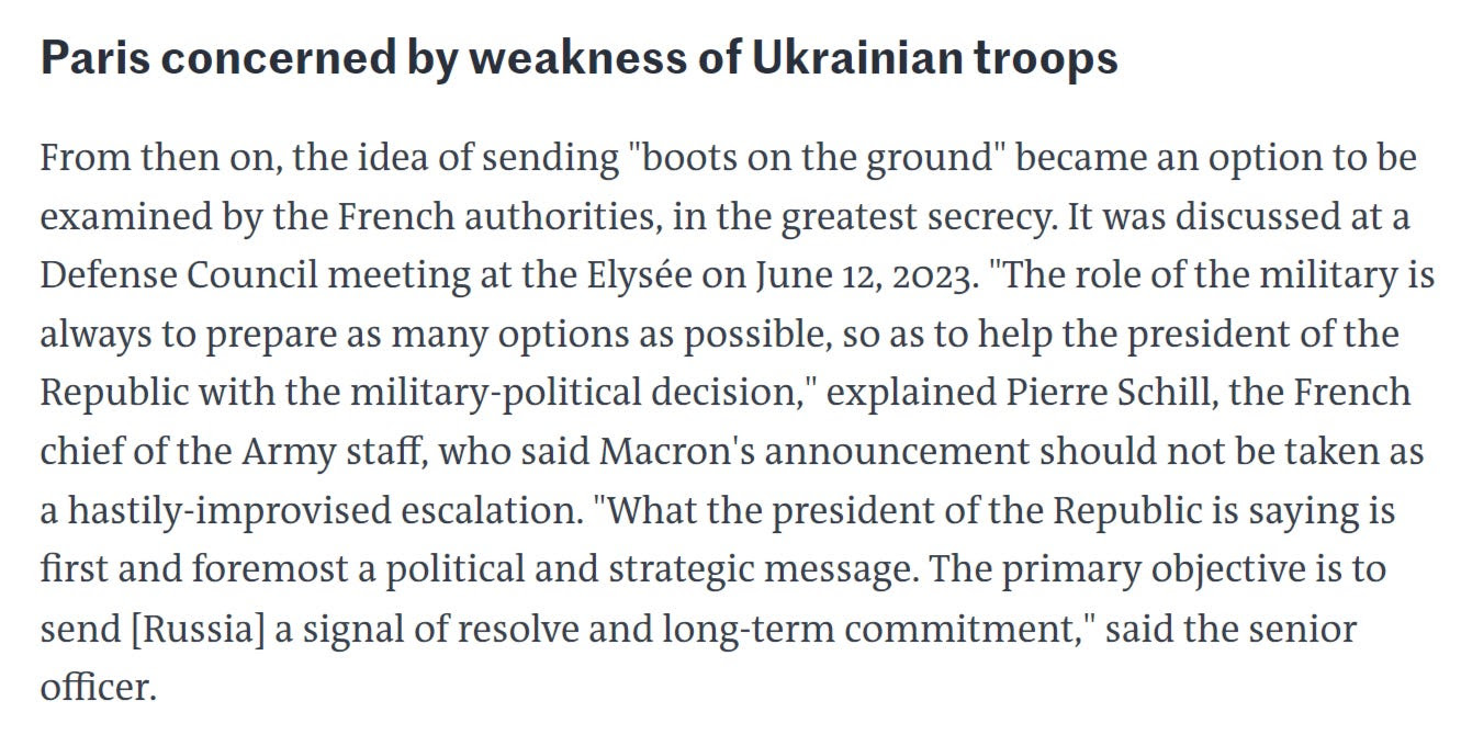 L’armée française avait déjà entamé des discussions secrètes sur l’envoi de troupes dès juin 2023, quelques jours seulement après que l’offensive désastreuse de l’Ukraine ait commencé à écrire sa fatalité sur le mur. Cela signifie qu’en dépit des faux-semblants de leurs aveux visant à remonter le moral du public, en interne, ils savaient, dès le premier fameux carambolage Leopard-Bradley, que c’était essentiellement fini pour l’Ukraine et que les troupes de l’OTAN seraient la seule solution possible pour empêcher la Russie d’ envahir tout le pays.