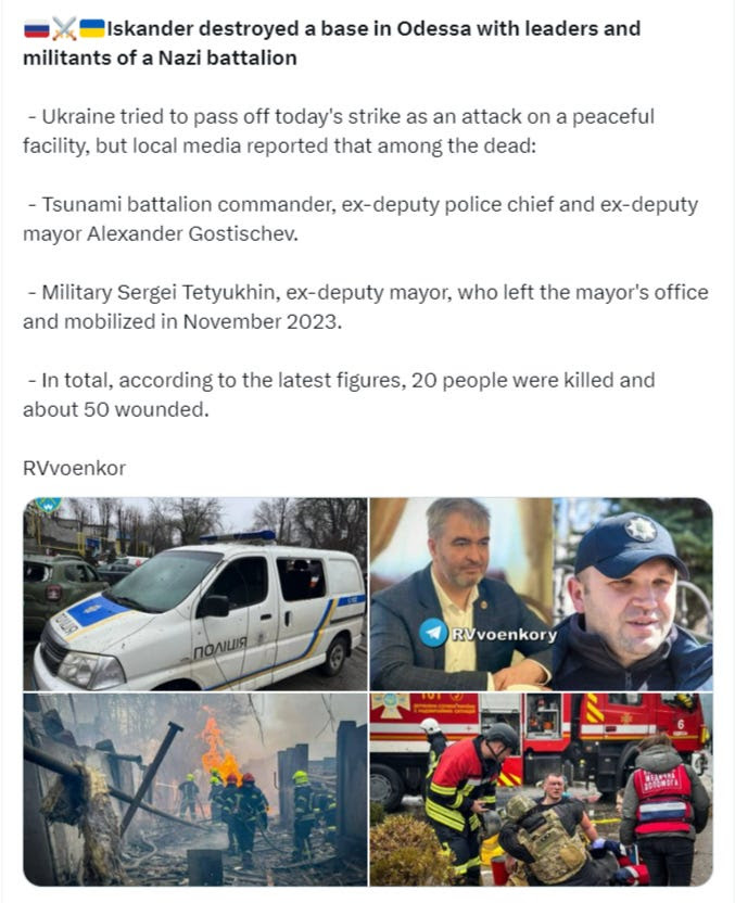 Enfin, il est très intéressant qu’aujourd’hui, juste après le théâtre télévisé musclé de Macron, la Russie ait frappé nul autre que… Odessa avec un énorme coup magistral qui aurait anéanti de nombreuses personnes importantes, et qui a même fait pleurer ouvertement la partie ukrainienne du fond du cœur