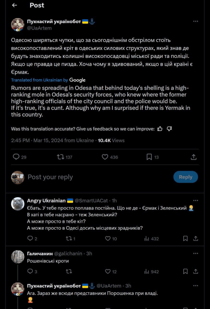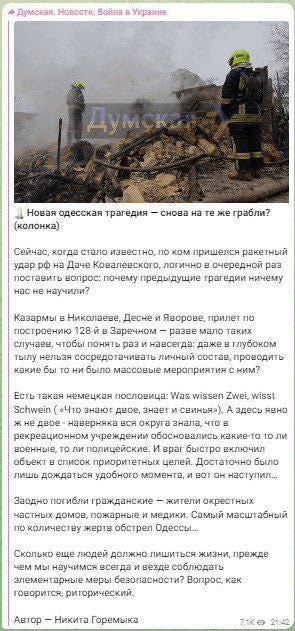 a publication ukrainienne Dumskaya aurait publié puis rapidement supprimé ce qui suit :