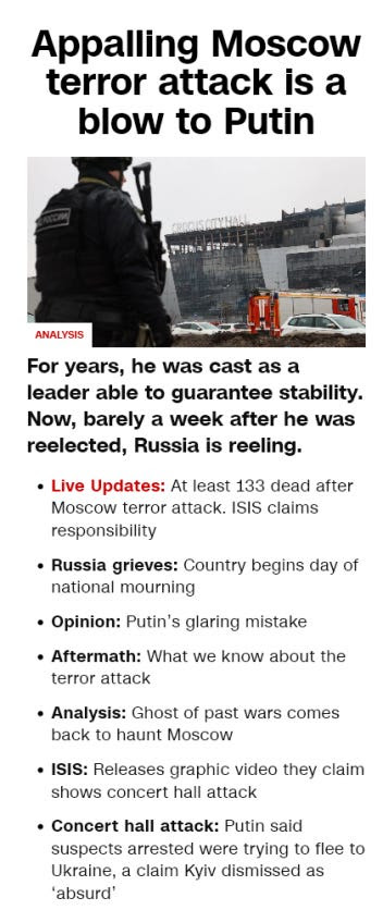 Dans ce cas, il était absolument primordial que l’Ukraine doive recourir aux services d’un tiers – elle a donc embauché quelques bouseux par un intermédiaire disposant d’un lien pratique avec « ISIS ». Mais le timing est trop ridicule pour le croire – il s’apparente aux « meilleurs coups » de la CIA, comme l’attaque au gaz tirée par les cheveux qu’Assad a menée juste au moment où il avait brisé le dos de l’ennemi et gagnait la guerre. Il est tout à fait incroyable qu’au moment même où la Russie avait porté des coups sans précédent à l’Ukraine, y compris une attaque aérienne massivement paralysante, et au moment même où les médias grand public diffusaient des tonnes de gros titres dévastateurs sur l’effondrement imminent de l’Ukraine, l’Etat islamique décide de lancer une attaque totalement inhabituelle. à Moscou? Il faut être complètement infantile pour croire que c’est le cas.