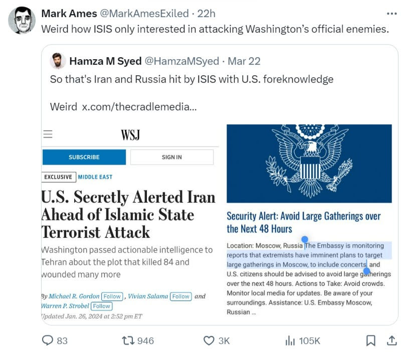 Les États-Unis et leurs amis veulent vraiment, vraiment, vraiment que vous sachiez que ce n’est pas l’Ukraine qui a commis les attentats de Moscou, mais bien « l’EI ».
