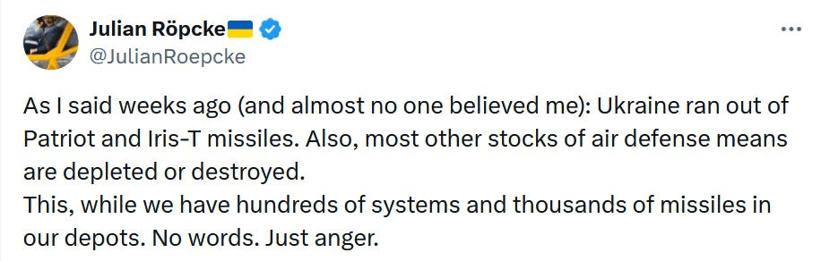 Maintenant que les choses s’échauffent de cette façon, l’Ukraine est en colère contre ces systèmes PatriotEn fait, Roepcke de Bild semble affirmer que l’Ukraine est totalement à court de missiles AD phares
