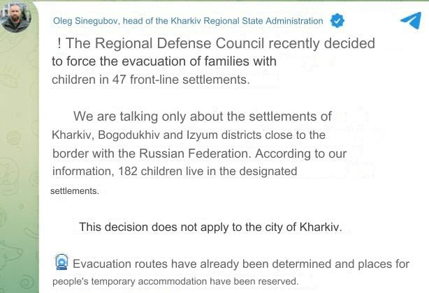 Alors, pour mettre la table, voici le chef de l’administration de Kharkov annonçant qu’il a pris la décision d’évacuer près de 50 colonies et villages dans la région nord de Kharkov, près de la frontière russe