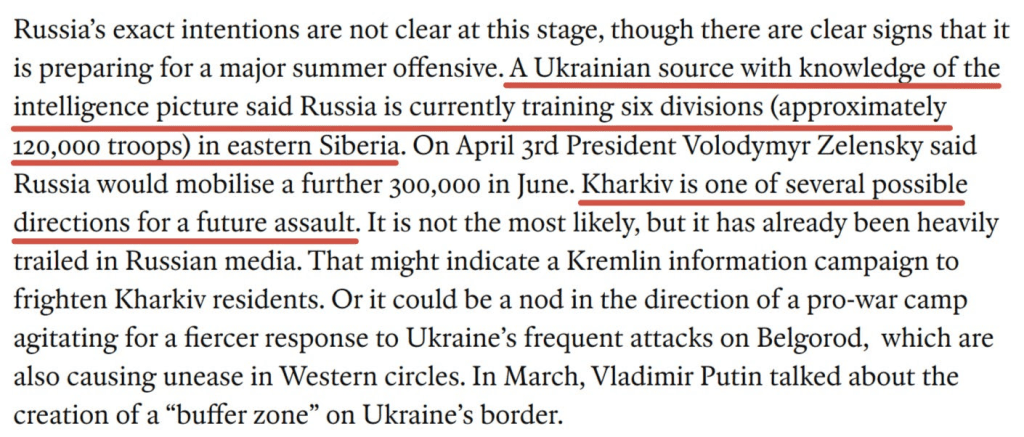 Ainsi : selon eux, la Russie se prépare à une « grande offensive d’été » et entraîne une armée de campagne massive de deux corps et six divisions en « Sibérie orientale », selon un haut responsable ukrainien.