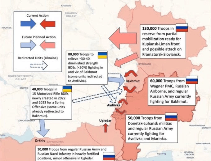 Le chiffre de 120 000 correspond presque précisément au nombre de troupes que la Russie a désignées pour chaque secteur ou front donné. Par exemple, le théâtre de Koupyansk-Kremennaya comptait environ 120 à 150 000 hommes. Le théâtre Zaporozhye aurait également à peu près ce montant ; et puis Donetsk aussi. La plupart de ces informations sont compilées à partir de diverses sources telles que les fuites du Pentagone, qui donnaient des informations sur la disposition des troupes russes. Mais à titre d’exemple, voici un graphique plus ancien et obsolète que j’ai trouvé dans ma collection juste pour vous donner une idée approximative