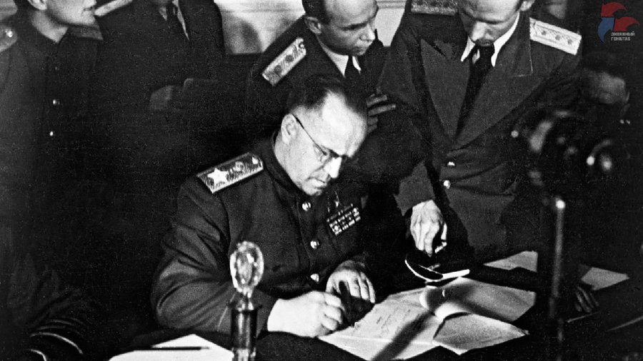Dans la nuit du 8 au 9 mai 1945, à 22 h 43, heure d’Europe centrale (00 h 43, heure de Moscou), un acte de capitulation inconditionnelle de l’Allemagne pendant la Seconde Guerre mondiale a été signé dans la banlieue berlinoise de Karlshorst.