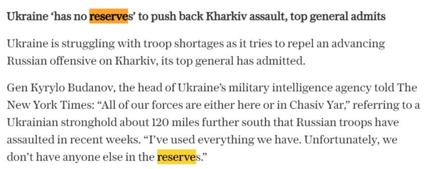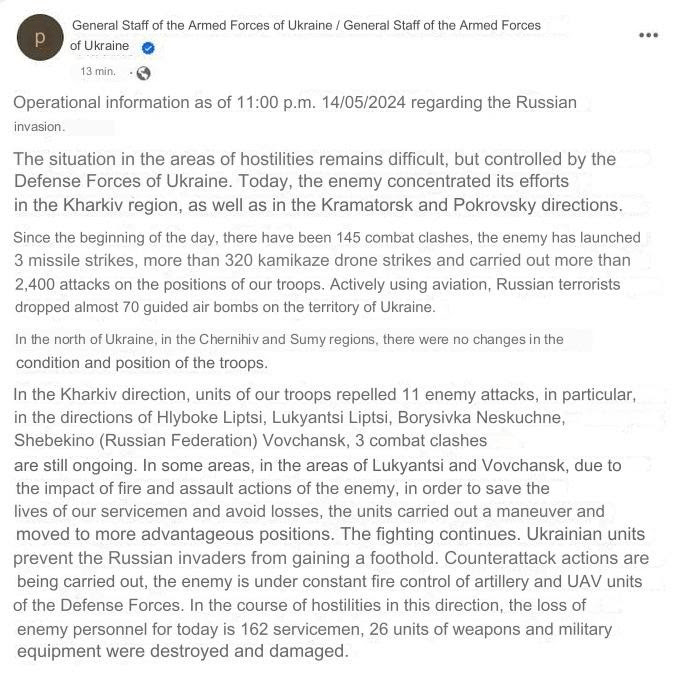Au moment d’écrire ces lignes, l’état-major général ukrainien a annoncé le retrait de Volchansk, la plus grande ville et bastion de la région nord de Kharkov, même s’il n’est pas encore clair s’il s’agit d’un retrait total ou partiel, car la formulation est ambiguë :
