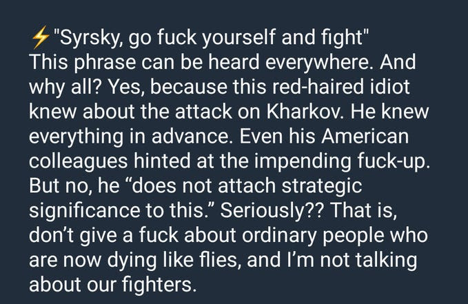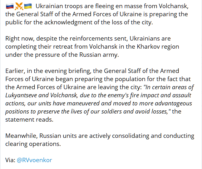 Au moment d’écrire ces lignes, l’état-major général ukrainien a annoncé le retrait de Volchansk, la plus grande ville et bastion de la région nord de Kharkov, même s’il n’est pas encore clair s’il s’agit d’un retrait total ou partiel, car la formulation est ambiguë :
