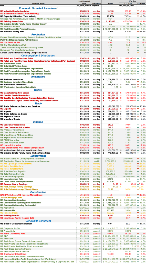 Mon point de vue sur l’économie actuelle est qu’elle continue de croître selon sa tendance (environ 2 %), ce qui est en baisse par rapport au 3e (4,9 %) et au 4e trimestre (3,2 %) de l’année dernière, mais seulement légèrement pour l’ensemble de 2023. (2,5%). D’un point de vue plus granulaire, il existe certains domaines de préoccupation, dont certains sont structurels (production industrielle) et d’autres liés aux taux d’intérêt (logement). Voici un aperçu des données économiques avec l’évolution d’une année sur l’autre :