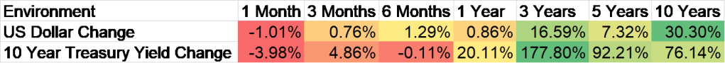 Le S&P 500 a réussi à réaliser un gain la semaine dernière, mais presque tout le reste était en baisse, principalement en raison des craintes liées aux taux d’intérêt. Les REIT ont de nouveau été particulièrement touchés, en baisse de 3,6 % sur la semaine et désormais de 6,5 % depuis le début de l’année. Ils sont toutefois en hausse de 9 % sur un an, ce qui est cohérent avec ce que nous avons vu dans le passé lorsque les taux culminaient. Si l’histoire sert de guide, les REIT connaîtront une forte hausse lorsque les taux entreront dans une tendance baissière à court terme. Depuis le début des années 70, lorsque l’industrie a émergé, les rendements des REIT lorsque la variation sur 6 mois du rendement du Trésor à 10 ans est négatif sont le double du rendement lorsque les taux augmentent. L’évolution sur 6 mois des taux à 10 ans est négative depuis quelques mois.