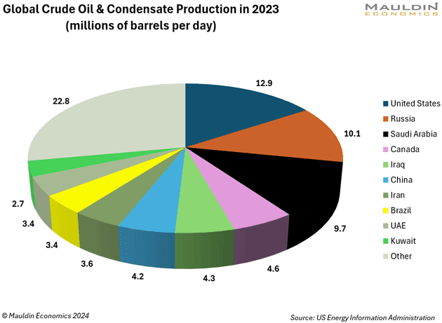 L’année dernière, les États-Unis ont produit 12,9 millions de barils par jour, soit plus de pétrole que n’importe quel autre pays. Et cela ne concerne pas seulement les États-Unis : la production mondiale totale devrait atteindre un niveau record de 102,7 millions de barils par jour cette année, avec une part croissante provenant de pays non membres de l’OPEP.