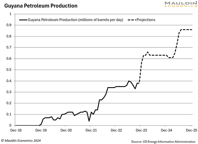 La production guyanienne devrait atteindre 860 000 barils par jour à la fin de l’année prochaine. ExxonMobil Corp. (XOM), leader du bloc pétrolier guyanais, voit sa production atteindre 1,3 million de b/j d’ici 2027.