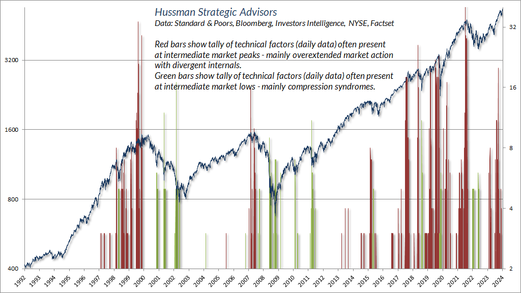 Ces derniers mois, j’ai élargi l’ensemble des syndromes comparables que nous surveillons dans les données quotidiennes, y compris les syndromes de compression à la baisse, dont j’ai périodiquement discuté dans des mises à jour spéciales au fil des ans. Les barres rouges montrent un décompte de facteurs techniques – caractérisés principalement par une action de marché trop étendue associée à des facteurs internes divergents – qui sont souvent présents lors des pics intermédiaires du marché. Les barres vertes montrent des facteurs techniques, principalement des syndromes de compression, qui sont souvent présents aux plus bas intermédiaires.