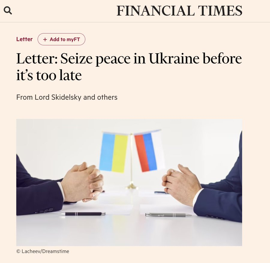 @PM_ViktorOrban’s peace efforts. Here’s the full text — please share! Russia’s latest military gains in the Donetsk region reinforce the case for a negotiated settlement of the war in Ukraine. The US and its allies support Ukraine’s key war aim, which is a return to the 2014 frontiers, i.e., Russia’s expulsion from Crimea and Donbas. But all informed analysts agree that short of a serious escalation of war, the likeliest outcome will be continued stalemate on the ground, with a not insignificant chance of a Russian victory. This conclusion points to the desirability, even urgency, of a negotiated peace, not least for the sake of Ukraine itself. Reluctance by the official west to accept a negotiated peace rests on the belief that anything short of a complete Ukrainian victory would allow Putin to “get away with it”. But this ignores by far the most important outcome of the war so far: that Ukraine has fought for its independence, and won it — as Finland did in 1939-40. Some territorial concessions would seem a small price to pay for the reality, rather than semblance, of independence. If a peace based on roughly the present division of forces in Ukraine is inevitable, it is immoral not to try for it now. Washington should start talks with Moscow on a new security pact which would safeguard the legitimate security interests of both Ukraine and Russia. The announcement of these talks should be immediately followed by a time-limited ceasefire in Ukraine. The ceasefire would enable Russian and Ukrainian leaders to negotiate in a realistic, constructive manner. We urge the world’s leaders to initiate or support such an initiative. The longer the war continues the more territory Ukraine is likely to lose, and the more the pressure for escalation up to a nuclear level is likely to grow. The sooner peace is negotiated the more lives will be saved, the sooner the reconstruction of Ukraine will start and the more quickly the world can be pulled back from the very dangerous brink at which it currently stands. Lord Skidelsky Professor Emeritus of Political Economy, University of Warwick Sir Anthony Brenton British Ambassador to Russia (2004-2008) Thomas Fazi Journalist, author, columnist for UnHerd Anatol Lieven Senior Fellow, Quincy Institute for Responsible Statesmanship Jack Matlock US Ambassador to the USSR (1987-1991) Ian Proud British Embassy in Moscow (2014-2019) Richard Sakwa Professor Emeritus of Russian and European Politics, University of Kent Christopher Granville British Embassy, Moscow (1991-1995) https://ft.com/content/90185a02-8107-47c0-ae6f-b06e88b796b5