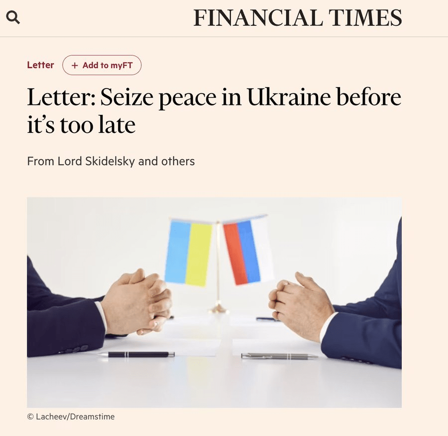 Cela a été amusant d’observer la réaction absolument Hysterique de l’establishment pro-OTAN et pro-guerre à notre lettre publiée hier dans le Financial Times en faveur des négociations de paix.