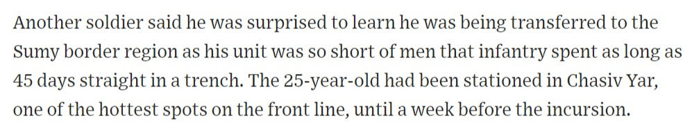 Comme je l’ai indiqué la dernière fois, environ 20 % des renforts du Koursk proviennent d’autres fronts. Politico le confirme :