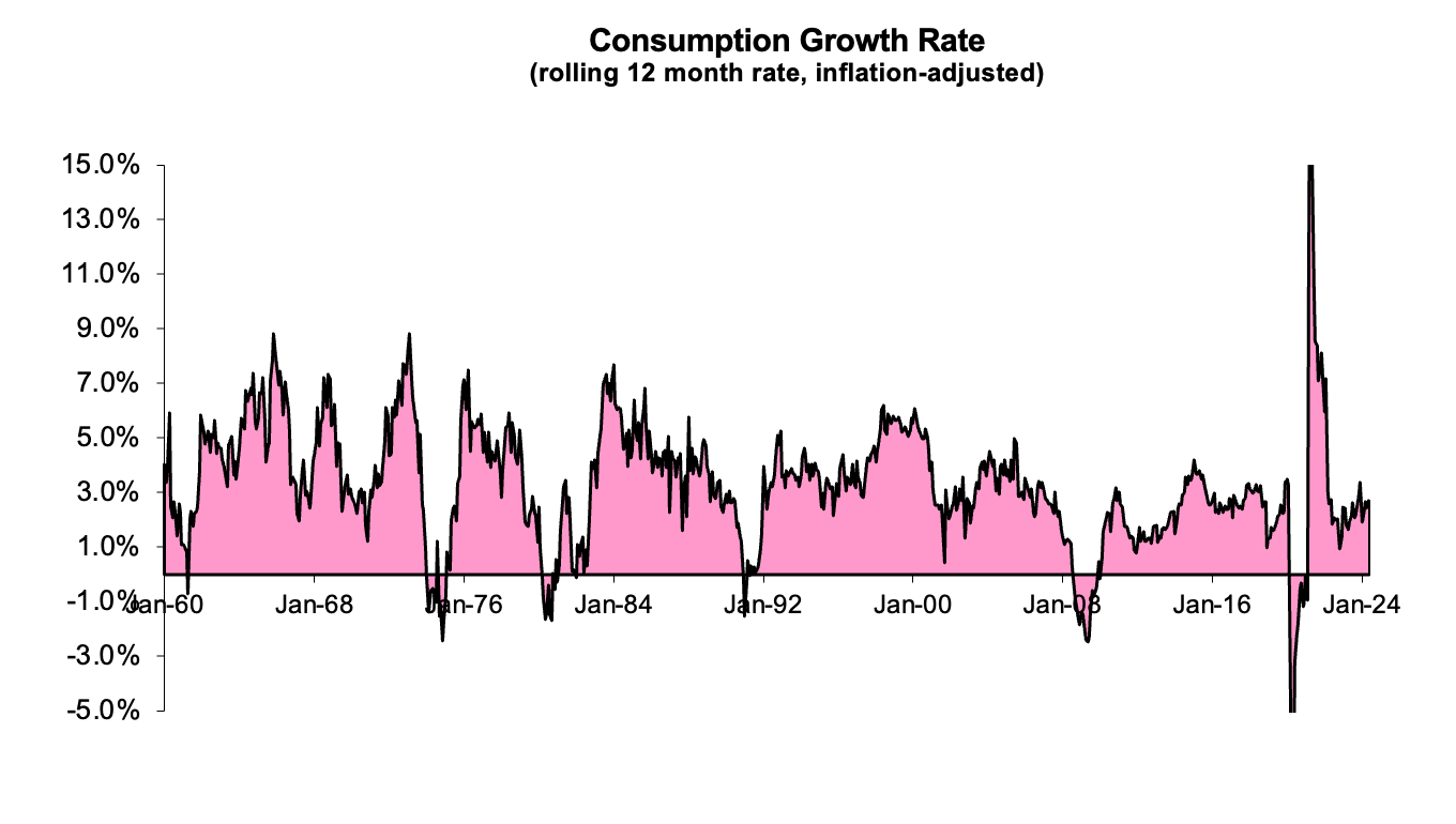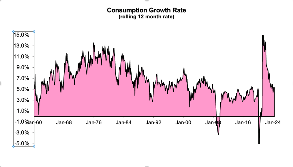Alors, où en sommes-nous aujourd’hui ? À mon avis, nous assistons à une croissance des dépenses de consommation corrigée de l’inflation, qui passe d’un niveau extraordinairement élevé à un niveau normal. Il n’y a pas de quoi s’inquiéter pour l’instant.