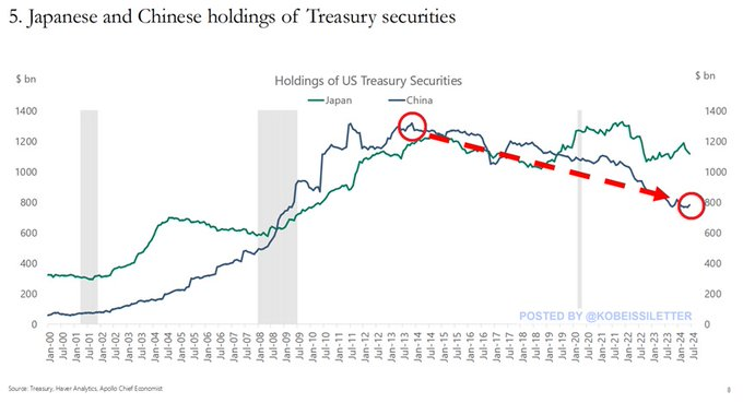 La Fed a choisi de réduire ses taux de 50 pbs cette semaine, avec un PIB actuel de la Fed d’Atlanta (T3) prévu à 2,93 %, et un indice des prix à la consommation de base d’août en hausse de 3,2 % en glissement annuel , avec une dette non financière qui augmente à un taux annualisé et corrigé des variations saisonnières de 3,522 milliards de dollars au 2e trimestre, dette qui accommode des déficits annuels du gouvernement de 2 trillions de dollars; pendant que les États-Unis affichant un déficit massif du compte courant de 267 milliards de dollars au T2.