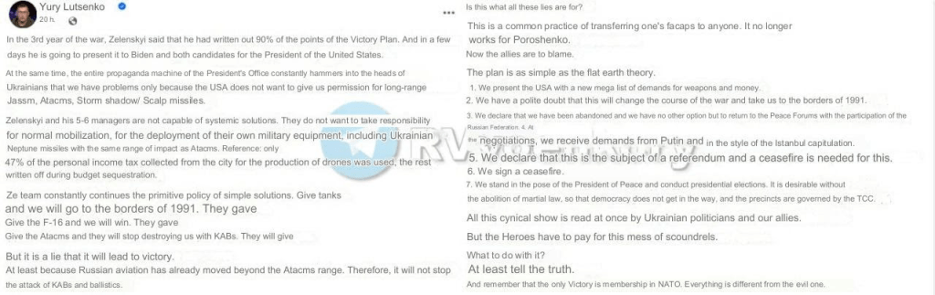 « Toute la machine de propagande du bureau du président martèle constamment dans la tête des Ukrainiens que nous avons des problèmes uniquement parce que les États-Unis ne veulent pas nous donner l’autorisation d’utiliser des missiles à longue portée Jassm, Atacms, Storm Shadow/Scalp », écrit Loutsenko.