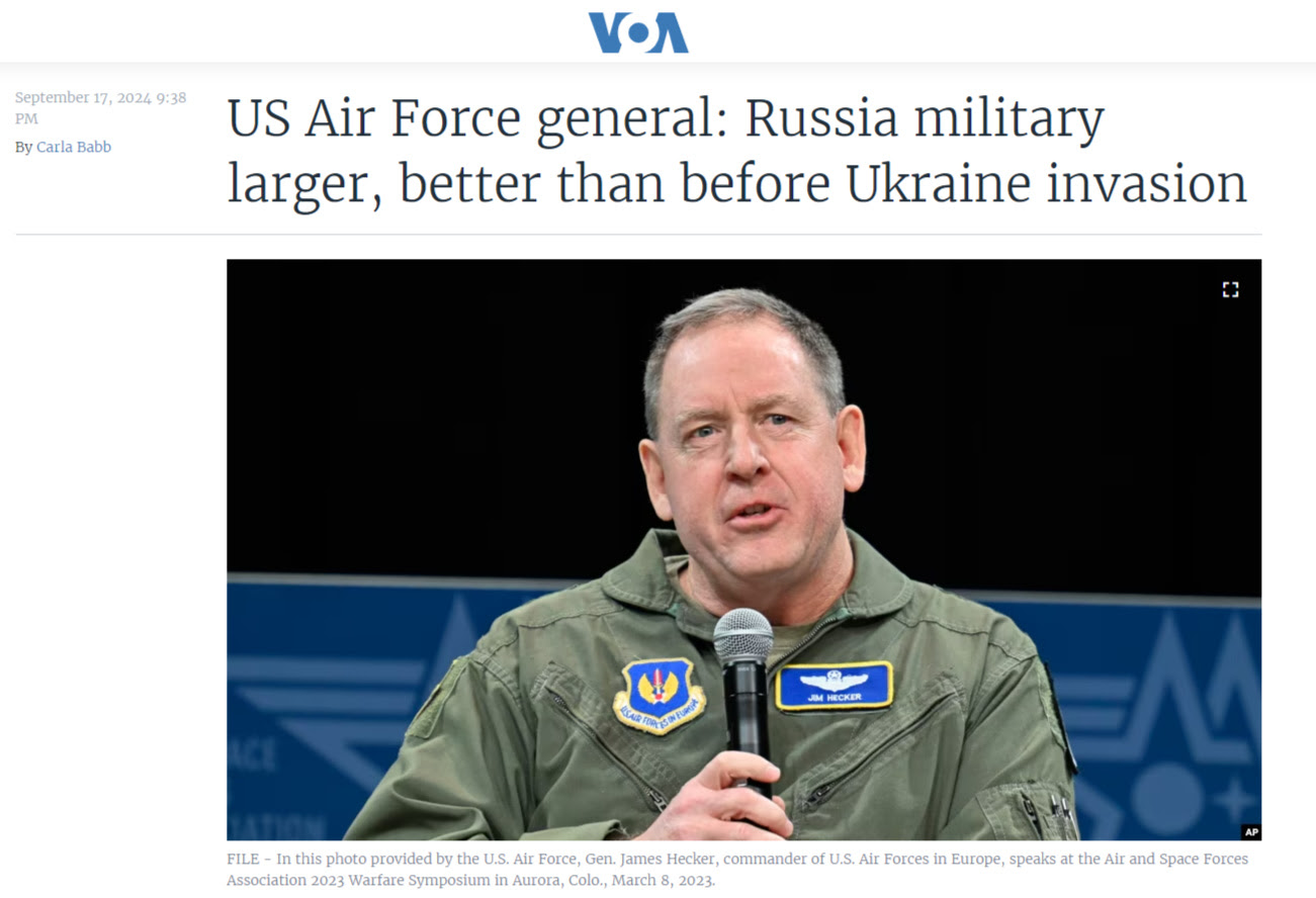 En fait, les généraux américains affirment à nouveau – comme Christopher Cavoli il y a quelques mois – que l’armée russe est désormais plus grande et meilleure qu’avant l’invasion