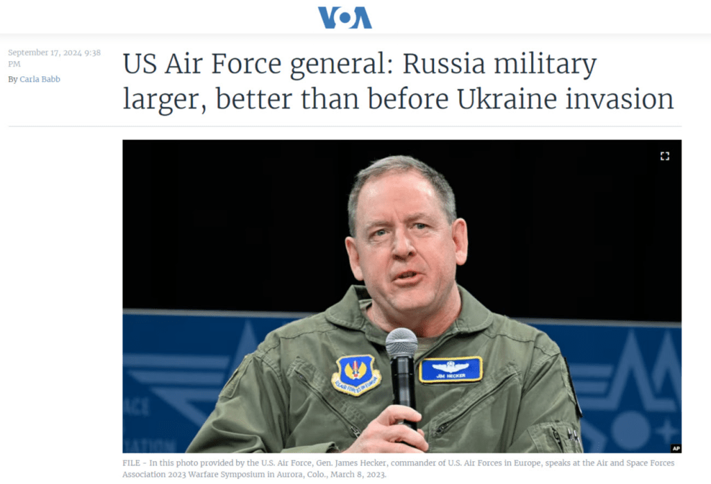 « La Russie s’agrandit, et elle s’améliore par rapport à ce qu’elle était auparavant. […] Elle est en fait plus grande qu’elle ne l’était lorsque [l’invasion] a commencé », a déclaré le général de l’armée de l’air James Hecker aux journalistes lors de la conférence annuelle Air, Space & Cyber de l’Air & Space Forces Association.
