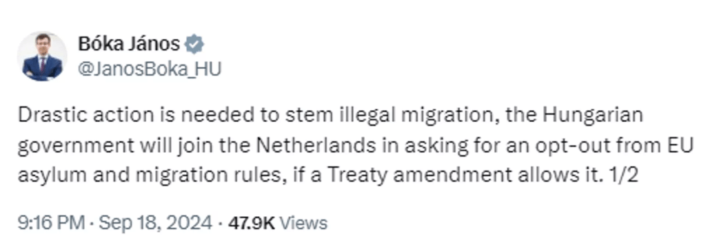 La Hongrie va également demander à ne pas participer aux politiques migratoires de l’Union européenne, a déclaré le ministre hongrois des Affaires européennes Janos Boka dans un message sur X. La Hongrie a traditionnellement opté pour une politique migratoire plus stricte que le reste de l’Union. Lors de la crise migratoire européenne de 2015, le Premier ministre Viktor Orban a rejeté la réinstallation de centaines de milliers de migrants et de réfugiés en provenance de Syrie, d’Afghanistan et d’autres pays déchirés par le bellicisme de l’OTAN.