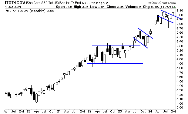 En raison de l’assouplissement des conditions monétaires par ces deux puissantes entités (la Fed et les autorités financières chinoises), le ratio mondial entre actions et obligations vient de sortir d’une formation en drapeau haussier à la hausse.