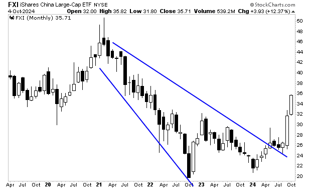 Les autorités Chinoises , injectent désormais activement des liquidités et des mesures de relance dans son système financier. Les actions chinoises viennent d’exploser à la hausse, mettant fin à une tendance baissière de trois ans.