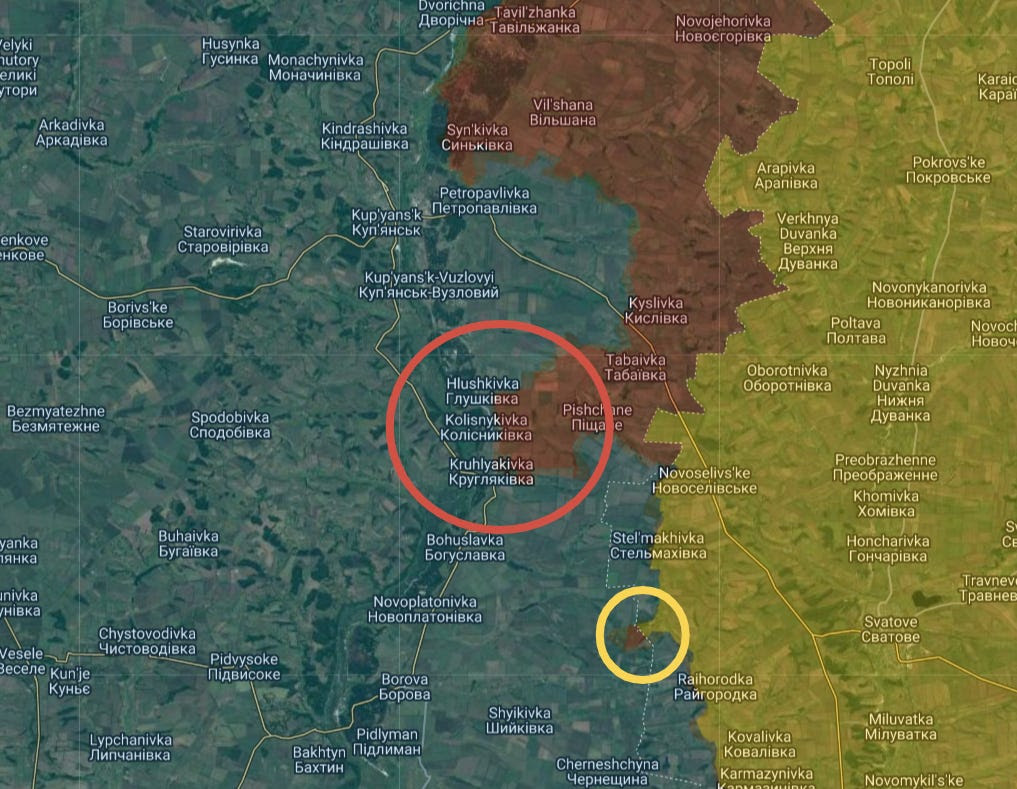Il y a beaucoup d’autres petites avancées réalisées dans cette région, y compris Vyshneve au sud (entouré en jaune) et toute la zone entourée en rouge, qui transforme tout ce qui se trouve entre là et Sinkovka en un chaudron géant piégé contre la rivière Oskil