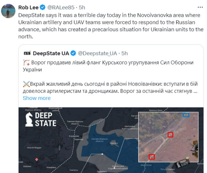 Les autres grandes avancées ont eu lieu dans la région de Koursk, où la Russie semble avoir lancé une mini-offensive qui a eu pour résultat le recul immédiat des forces ukrainiennes, bien que les premiers rapports de « colonnes fuyant dans la région de Soumy » aient été réfutés par des sources russes – au contraire, les FAU tentent d’introduire des réserves et de tenir leurs positions.