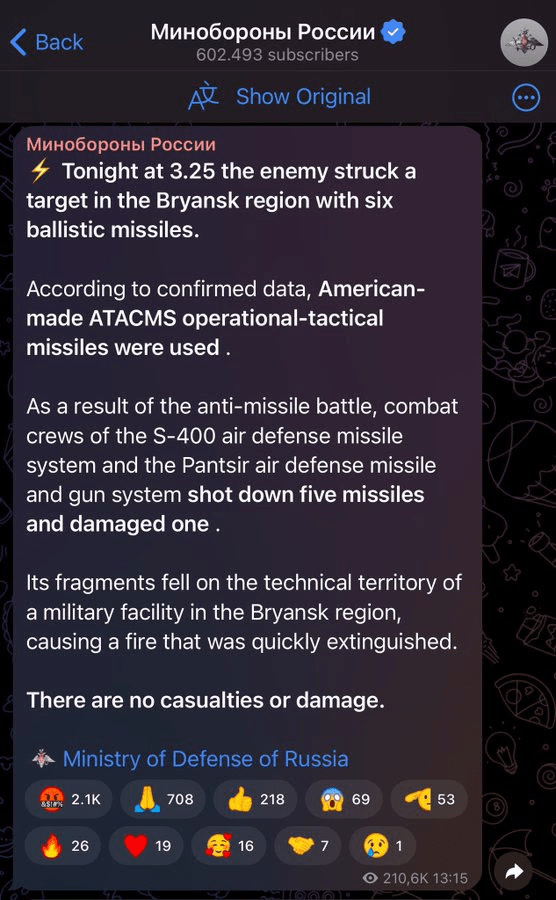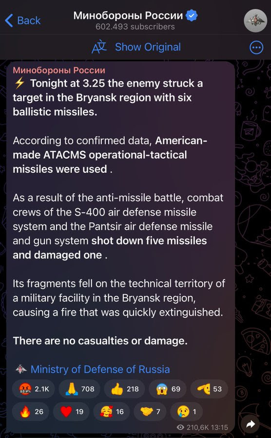 La différence cette fois-ci est que le MOD russe lui-même a officiellement annoncé l’utilisation de 6 ATACMS, dont 5 auraient été abattus :