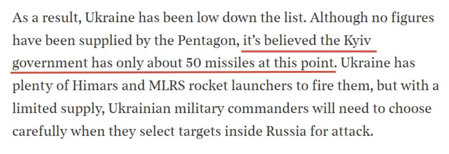 Le Sunday Times britannique affirme que l’Ukraine ne possède que 50 missiles ATACMS, donc si 6 sont utilisés contre des objets inutiles, cela réaffirme à nouveau tout ce que nous savons sur l’impulsion stratégique restante de Zelensky.
