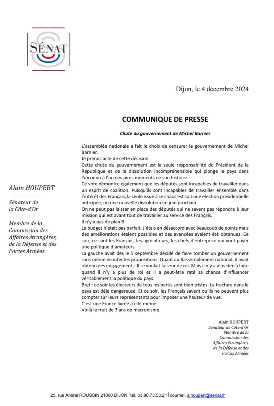 4 décembre 2024 Un communiqué intéressant, raisonnable, de Alain Houpert Partager : Cliquer pour partager sur X(ouvre dans une nouvelle fenêtre) X Cliquez pour partager sur Facebook(ouvre dans une nouvelle fenêtre) Facebook J’aime chargement… Similaire