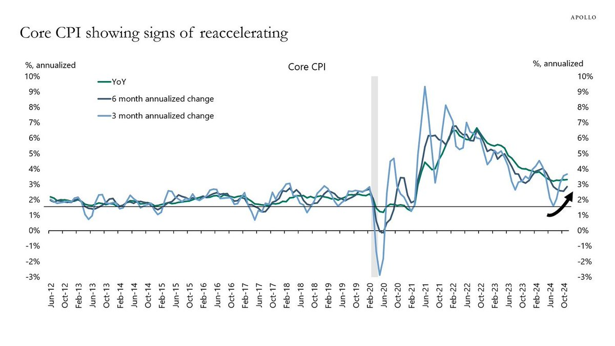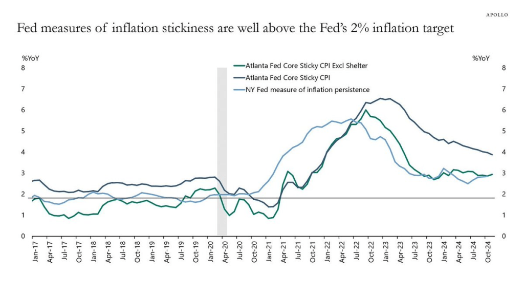 Les mesures d’inflation de la Fed et des marchés sont désormais toutes supérieures à l’objectif de 2 % de la Fed. Nous risquons un rebond de l’inflation du type des années 1970 en 2025/2026. affirme la firme très suivie Apollo, elle, pense que la probabilité que la Fed augmente ses taux d’intérêt en 2025 est désormais en hausse.