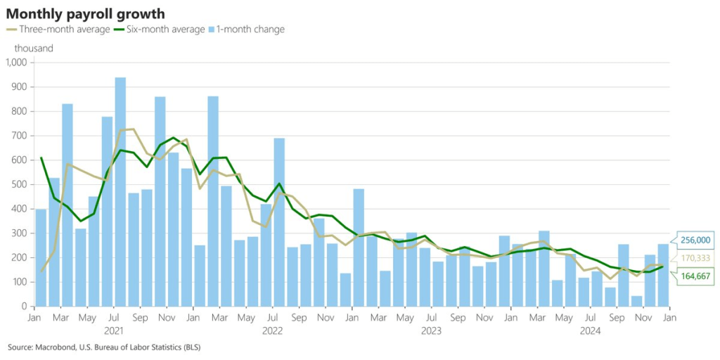 Pour commencer, l’économie américaine a créé 256 000 emplois en décembre, soit 92 000 de plus que prévu. En moyenne, l’économie américaine a créé 165 000 emplois au cours des six derniers mois. Il s’agit de la moyenne sur six mois la plus élevée depuis juillet 2024, lorsque les baisses de taux de la Fed ont été retardées.