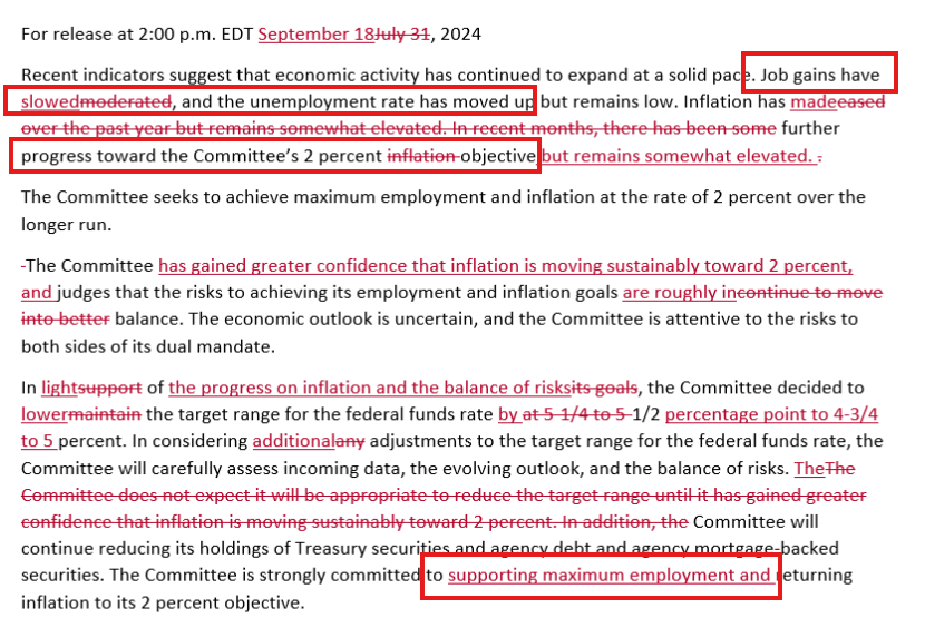 Voici la déclaration de politique de la Fed de septembre 2024. Ellle montre clairement l’erreurd e prevsiond ela Fed a cette epoque.la gouverneure Bowman qui etait reticente face ala baisse des taux avait bel et bien raison