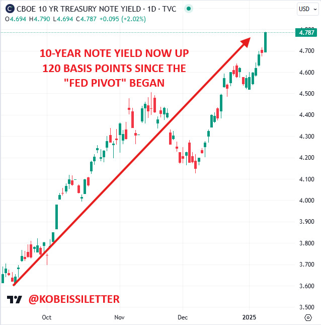 Après la publication des chiffres de l’emploi ce matin, le rendement des obligations à 10 ans a bondi de 10 points de base supplémentaires. Il est désormais en hausse de 120 points de base depuis le début du « pivot de la Fed ». Powell a décrit cela comme quelque chose qui « ne devrait pas durer ». Le marché se bat contre la Fed .