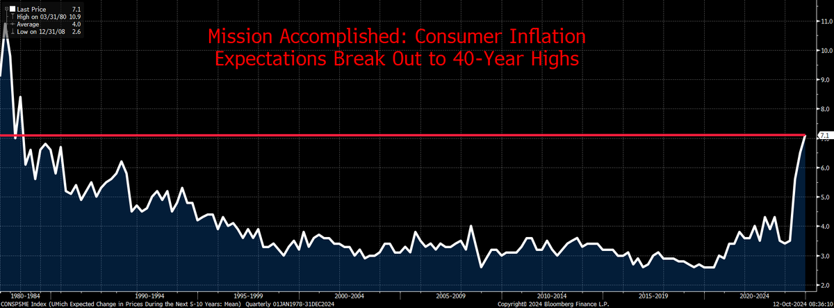En fait, après la baisse de 50 points de base des taux de la Fed, les attentes d’inflation des consommateurs ont atteint leur plus haut niveau depuis 1980 ! À l’exception de la Fed, presque tout le monde s’attend désormais à une inflation plus élevée.