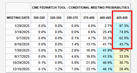 Le scénario de base montre désormais une probabilité de 44 % qu’il n’y ait aucune baisse des taux d’ici juin 2025. Il y a quelques mois, les marchés prévoyaient plus de 5 baisses de taux en 2025. Alors que les baisses de taux d’intérêt sont exclues, le rendement des obligations à 10 ans approche les 5 %. Ne sous-estimez pas l’importance de cela.