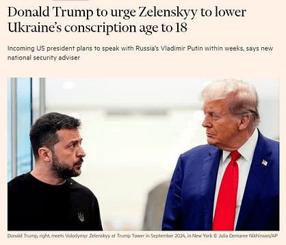 Le FT rapporte une interview avec le conseiller à la sécurité nationale choisi par Trump, Mike Waltz, qui déclare que l’administration Trump poussera l’Ukraine à abaisser l’âge de mobilisation à 18 ans :