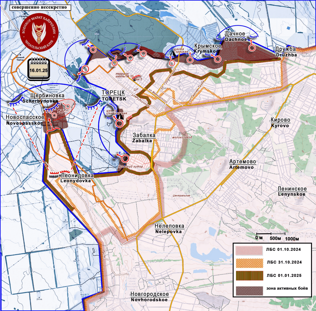 En fait, l’ennemi contrôle désormais principalement (sans compter la mine de Toretskaïa) le terril de la mine de Fomikha et une petite partie du quartier résidentiel à proximité. On peut affirmer que la défense ultérieure de l’ennemi dans la ville sera de courte durée, mais assez féroce, car sa perte de Toretsk offre à notre armée l’accès à Konstantinovka.