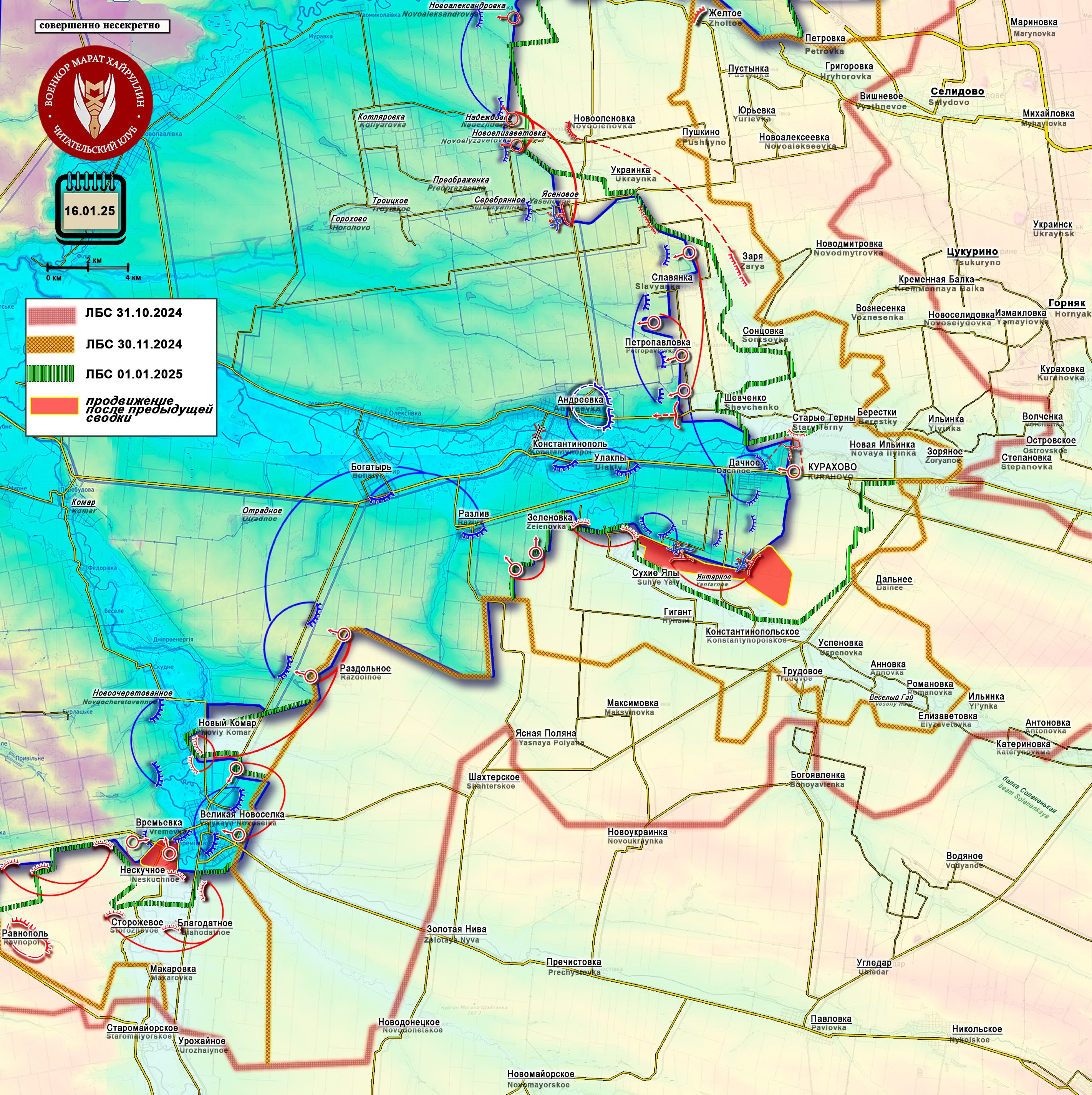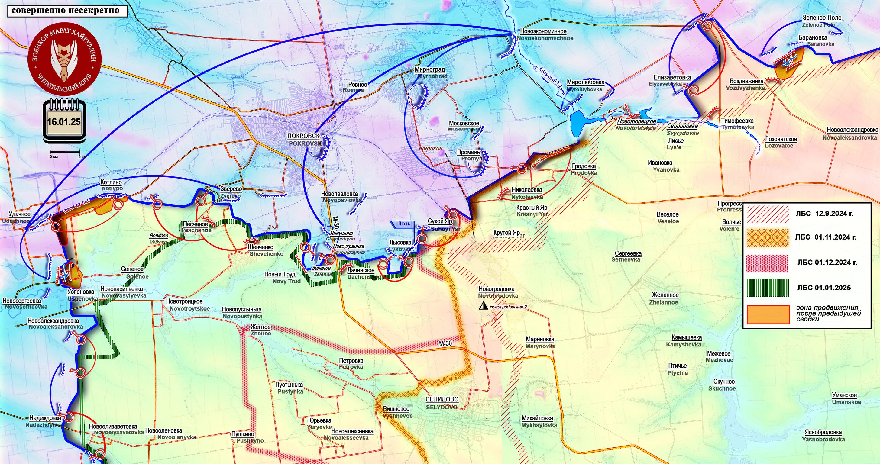ЛБС 12.9.2024=Ligne de contact de combat le 12 septembre 2024. ЛБС 01.11.2024=Ligne de contact de combat le 1er novembre 2024. ЛБС 01.12.2024=Ligne de contact de combat le 1er décembre 2024. ЛБС 01.01.2025=Ligne de contact de combat le 1er janvier 2025. Зона продвижения после предыдущей сводки=La zone d’avancement depuis le résumé précédent.